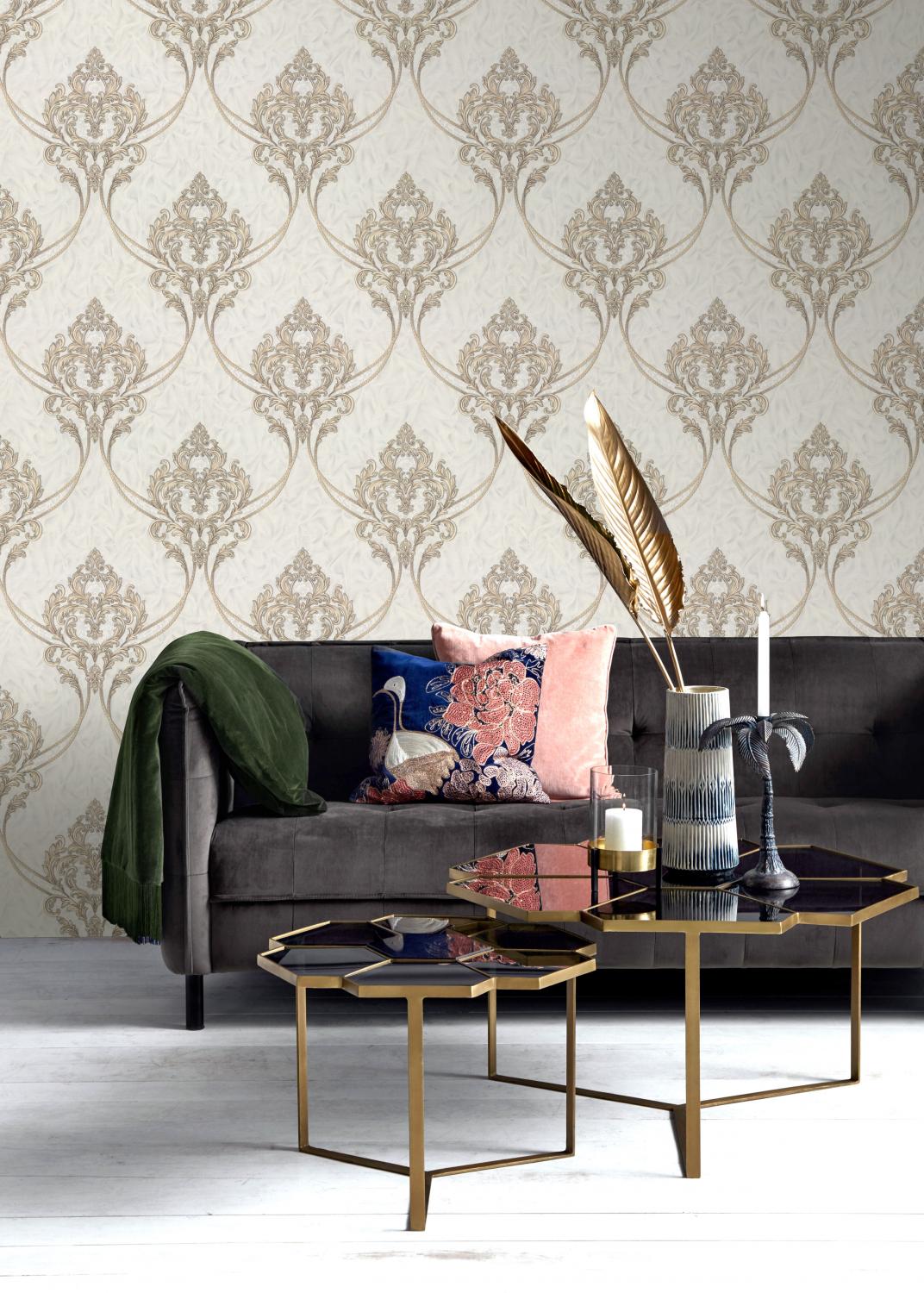 В мотиве крупные роскошные дамаски украшены широкими мазками металлика и посыпаны искрящимся глиттером. Замысловато переплетаясь, вензеля дамасков образуют ажурные притягательные формы, будто парящие в воздухе на тончайших ювелирных цепочках, также отделанных глиттером. Фон коллекции «Athena» покрыт сияющим перламутром и имитирует жатку — плотную ткань с хаотичными заломами и складками на поверхности, создающими мятую структуру. Такое дизайнерское решение подчеркивает основной мотив и придает коллекции лоск изысканности и дух аристократии.