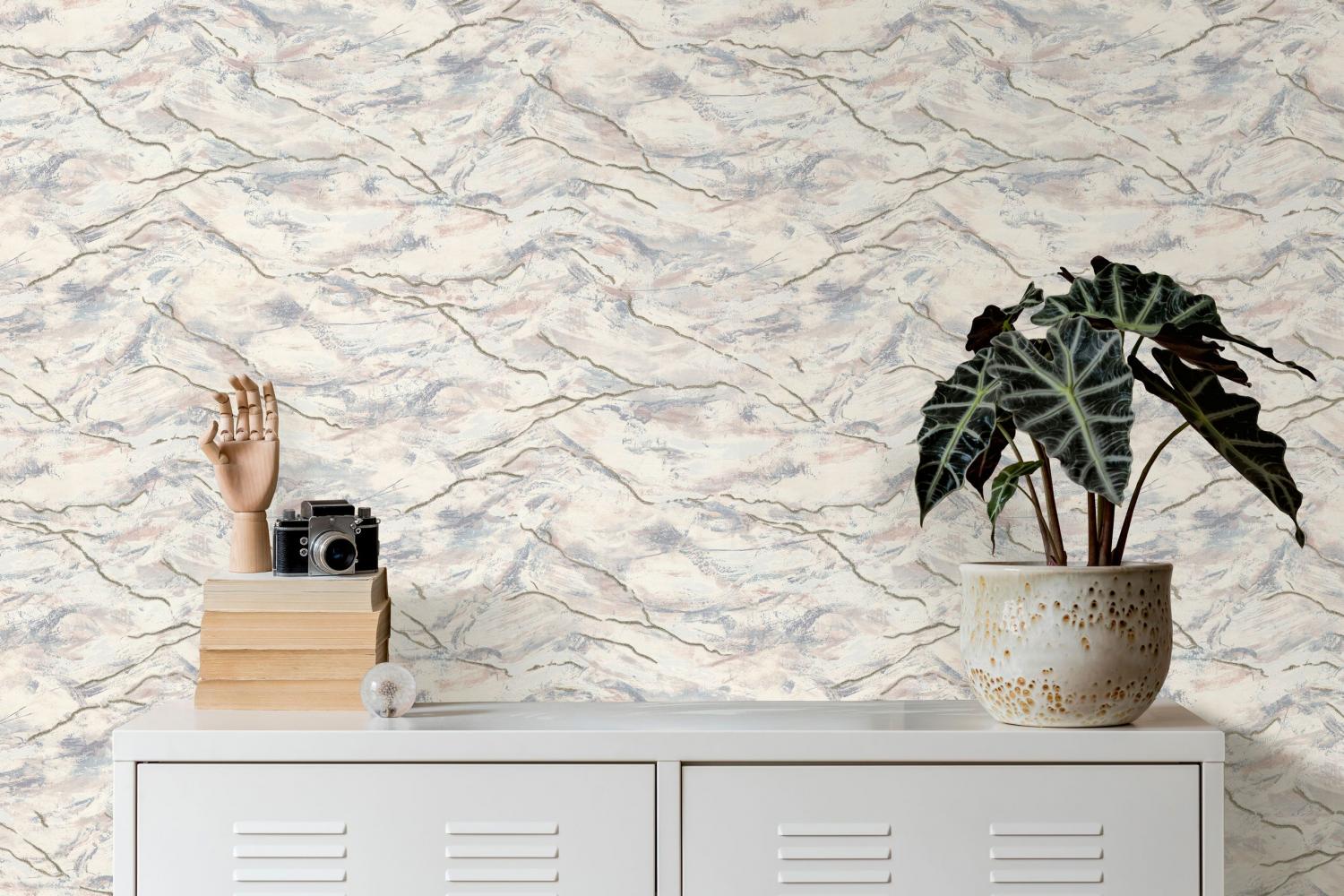 Коллекция обоев Calacatta — это классический дуэт из мотива и фона. Дизайн мотива имитирует благородный мрамор с плавными серебристыми или золотистыми росчерками прожилок. Они покрыты искрящимся глиттером и являются основным акцентом мотива. Узор, который образуют прожилки, отсылает к пейзажам величественных горных цепей, завораживающих и притягивающих взор. Колористики коллекции Calacatta представлены в спокойных цветах от нежно-бежевого и графитового до голубого и фиолетового. Фон, с текстурой имитирующей штукатурку, также выполнен в пастельных тонах, покрытых перламутром, благодаря чему создается впечатление сияния. Фон коллекции гармонично сочетается с мотивом и подчеркивает его изысканность.