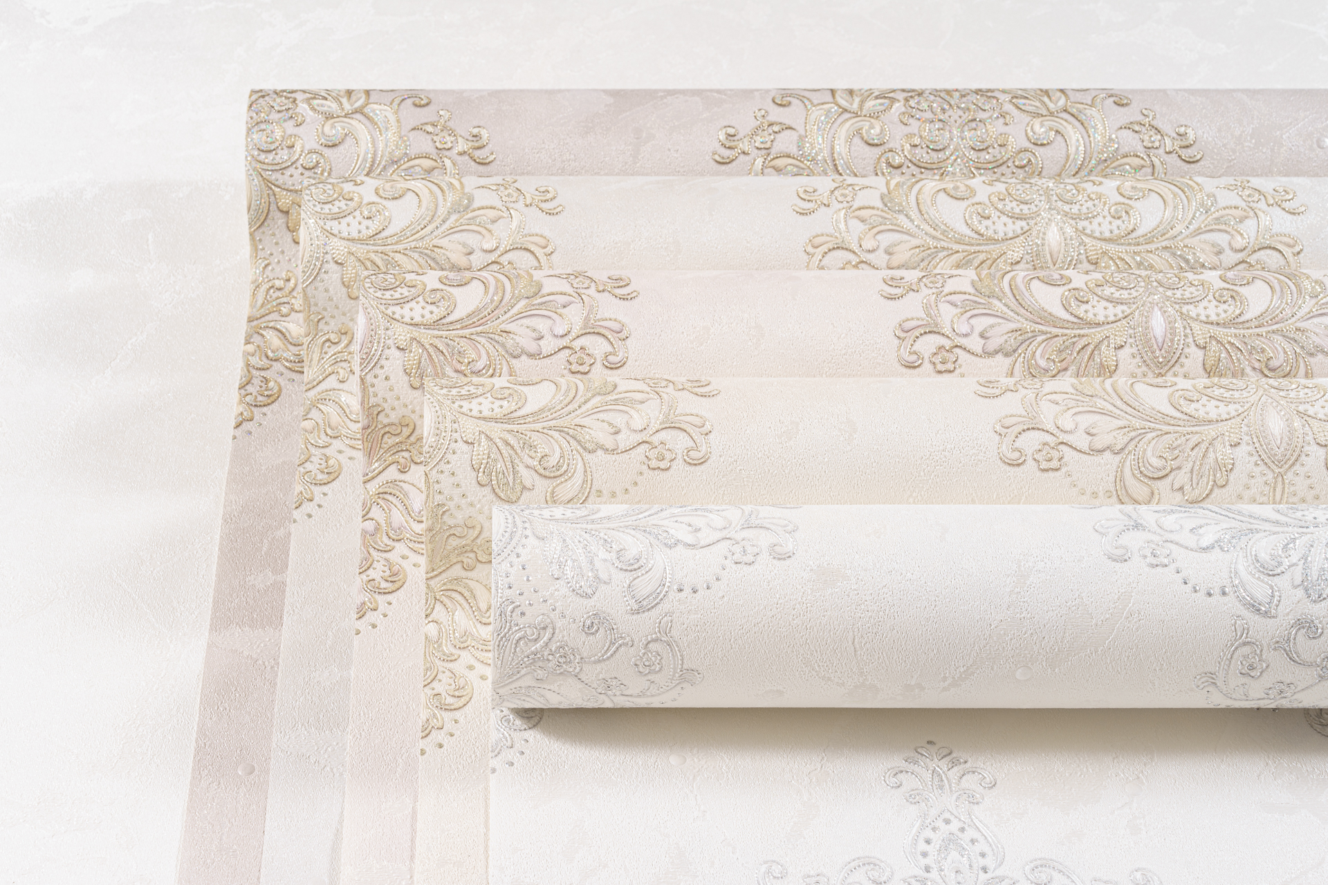 Современный дамаск на основном мотиве придется по вкусу любителям классических интерьеров, а однотонный светлый фон с эффектом под штукатурку можно комбинировать с любыми другими мотивами, а также использовать самостоятельно в интерьерах в минималистичном стиле.
